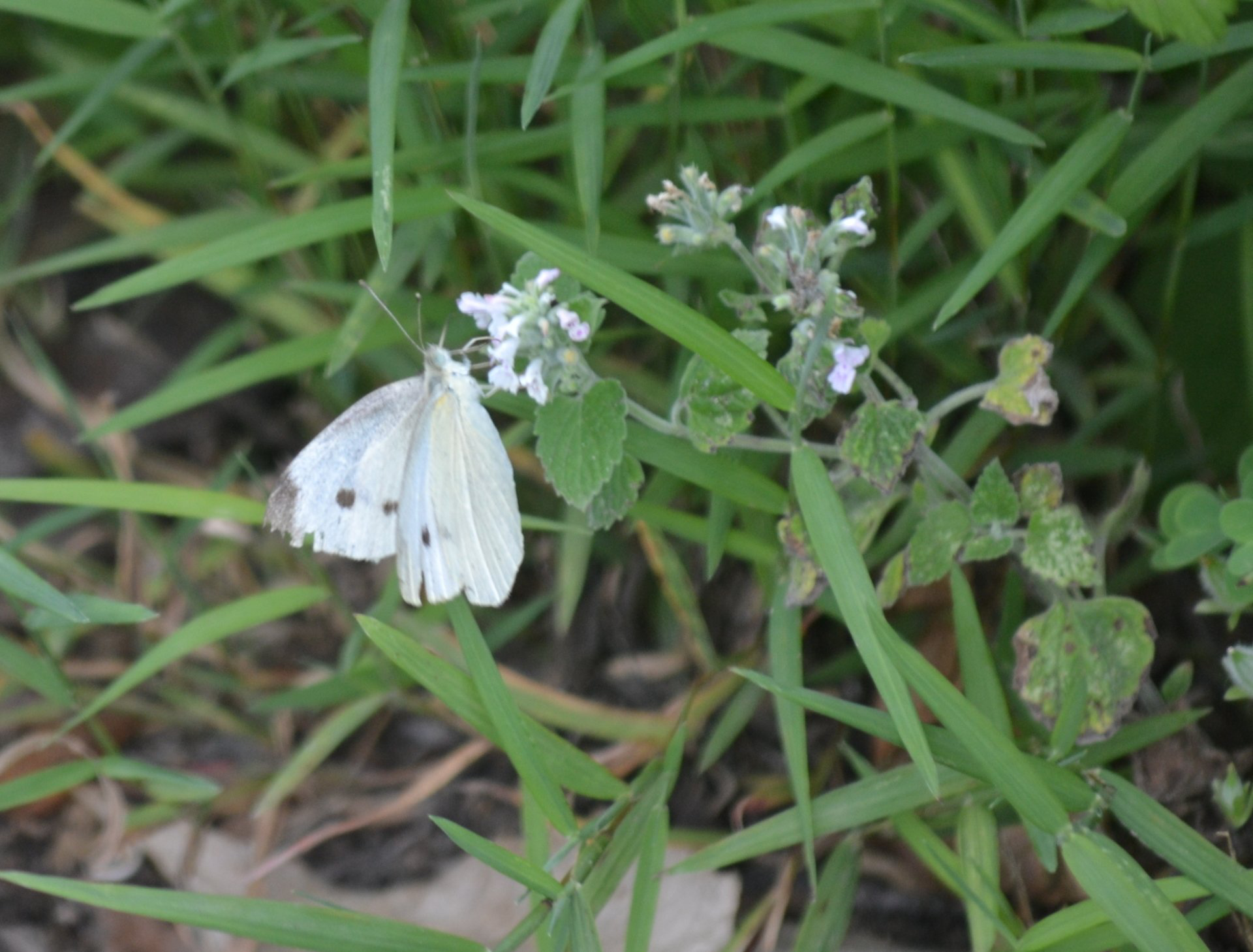 The Cabbage butterfly, Pieris rapae, also an early spring butterfly, is named for its preference for laying eggs on cabbage plants (and other vegetables in the brassica family) which the larvae then eat. This commonly seen butterfly, 1¼ to 1¾ inches, white with several black spots on its upper wings, may be in the Cedar Creek area all summer with up to three broods.