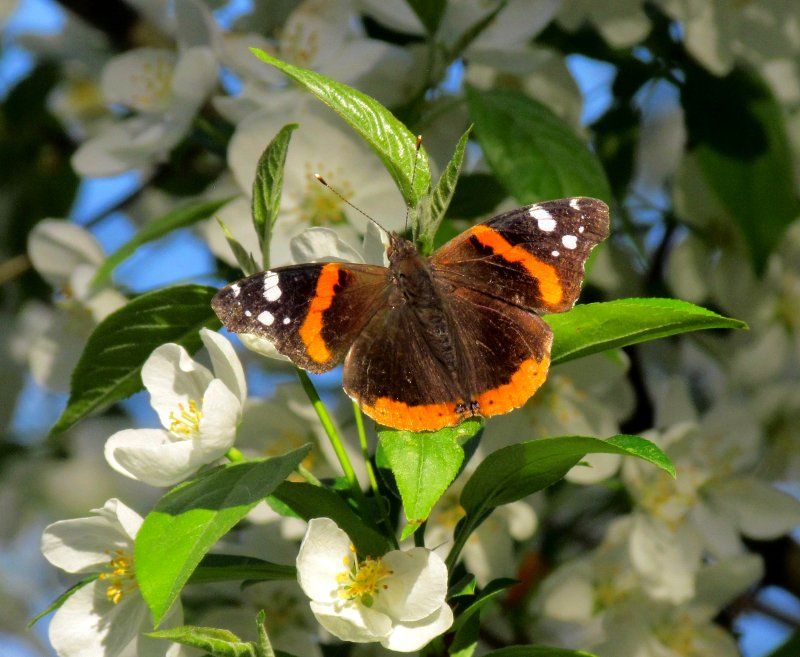 Early summer we also see two variations of the Admiral family, a fast-flying butterfly about 2” long whose broods occur in late June and July. The more common Red Admiral, Vanessa atalanta, has orangish/red bands around its hind wing, while the White Admiral, Limenitis arthemis, has a white band around the hind wing.